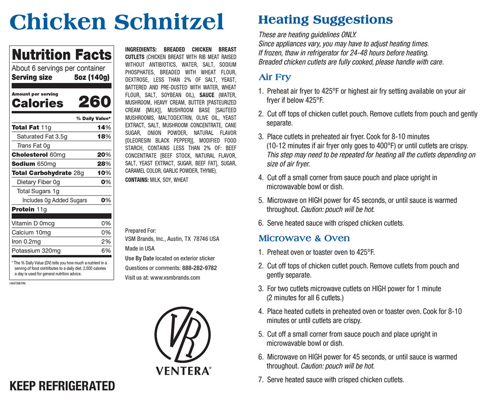 Our Products - VR-Ventera OTHER BRANDS VR-Ventera East West Cuisine Ventera Ranch Culinary Classics Private Label Chicken Schnitzel 6 Breaded Chicken Breast with Rib Meat Cutlets and a German Style Mushroom Sauce